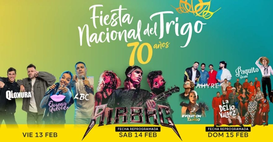 Además de la programación artística, la Fiesta Nacional del Trigo contará durante los tres días con feria de artesanos y emprendedores, patio gastronómico, exposición comercial, industrial y de servicios, y las actividades tradicionales que forman parte de la identidad del evento, entre ellas la Elección de la Reina Nacional del Trigo.
