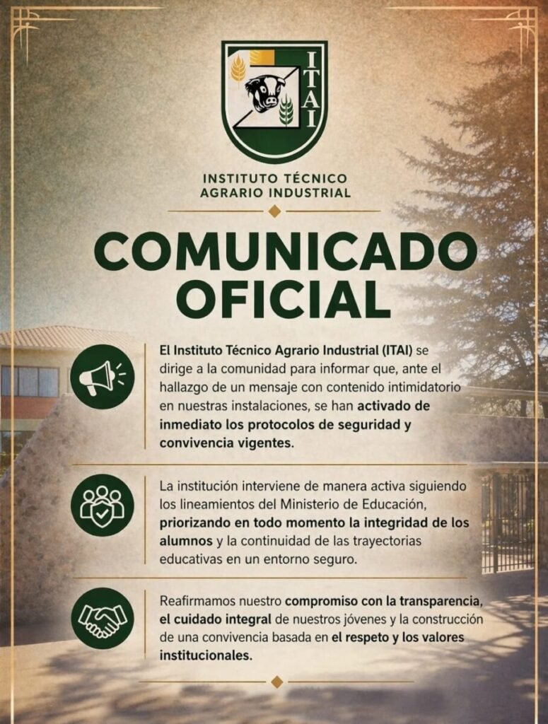 Durante la mañana, el ITAI difundió un comunicado dirigido a las familias y a toda la comunidad educativa. Allí expresó preocupación por la circulación del mensaje amenazante, pero llevó tranquilidad al informar que se implementaron todas las medidas previstas y se realizó la denuncia correspondiente ante las autoridades competentes.