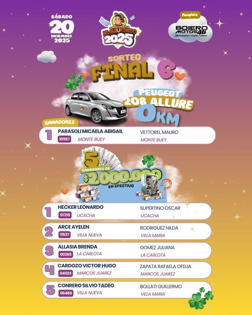 El sorteo fue seguido desde Monte Buey, ya que la ganadora no viajó al evento, y el premio obtenido fue nada menos que un Peugeot 208 0 km. Por el momento, la familia analiza qué decisión tomar con el vehículo, algo que será conversado tanto puertas adentro como con la organización del sorteo.