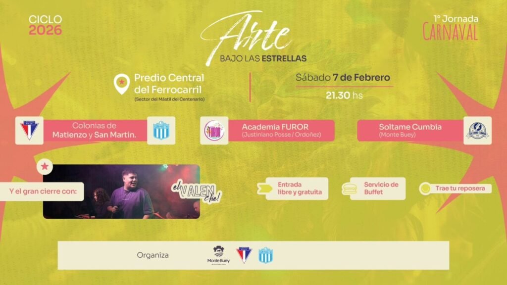 El ciclo cultural de verano Arte Bajo las Estrellas tendrá su primera jornada el sábado 7 de febrero en el predio del ferrocarril, en el sector del mástil, con una propuesta especial de noche de carnaval, entrada libre y gratuita y múltiples atractivos para toda la familia.