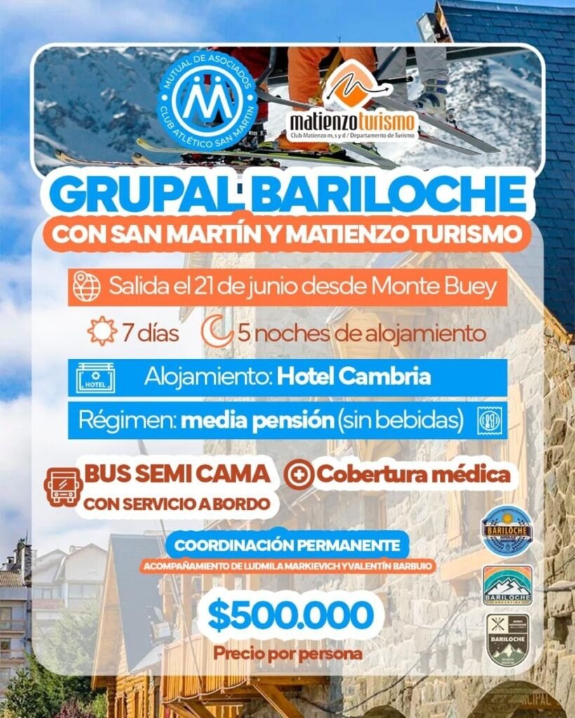 Los departamentos de turismo del Club Matienzo y de la Mutual de Asociados del Club Atlético San Martín presentaron una propuesta conjunta para viajar a San Carlos de Bariloche durante el mes de junio, con una salida grupal pensada para vecinos de Monte Buey y la región.
